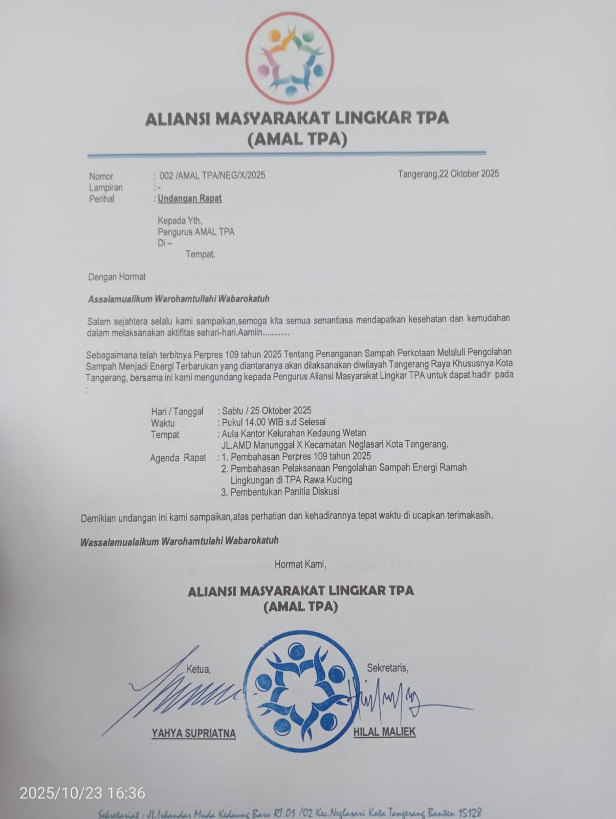 Dalam surat undangan resmi bernomor 002/AMAL TPANEG/X/2025, yang ditandatangani oleh Ketua Yahya Supriatna dan Sekretaris Hilal Maliek, disebutkan bahwa kegiatan ini menjadi langkah strategis untuk menyamakan pemahaman terkait penerapan pengelolaan sampah modern berbasis energi terbarukan di wilayah TPA Rawa Kucing, Kota Tangerang.