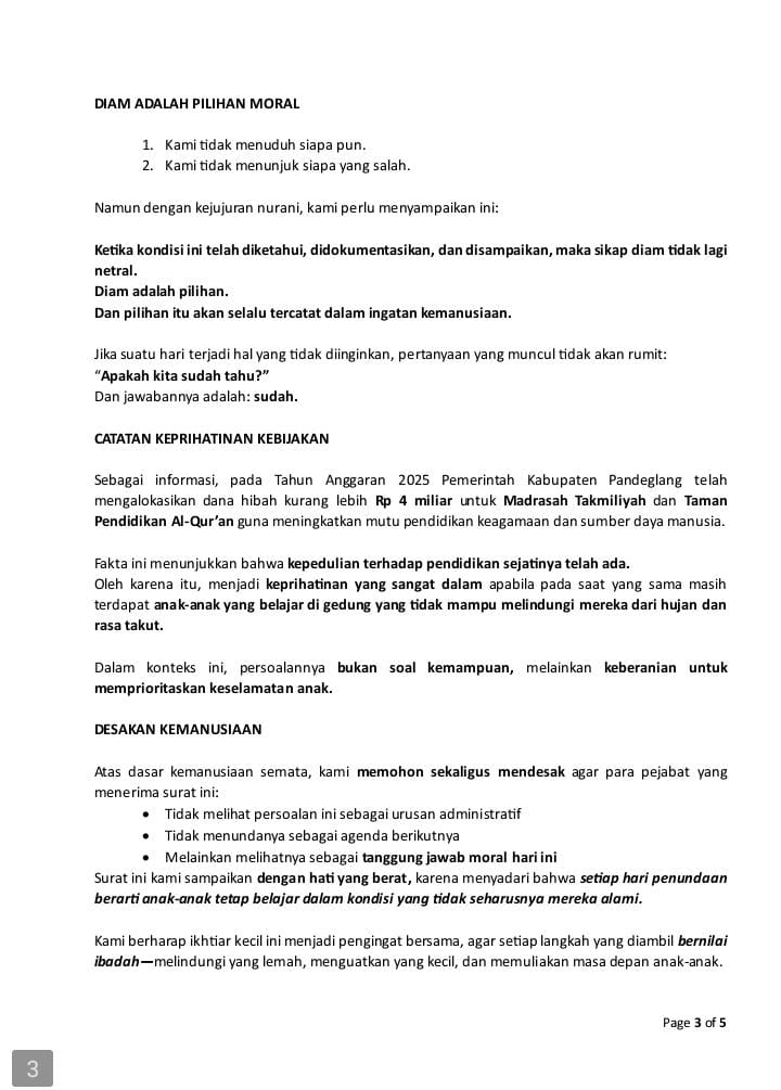 “Ini bukan soal status sekolah, bukan pula soal prosedur. Ini soal anak-anak yang setiap hari belajar dalam kondisi yang tidak seharusnya mereka alami,” demikian salah satu penegasan dalam nota tersebut.
