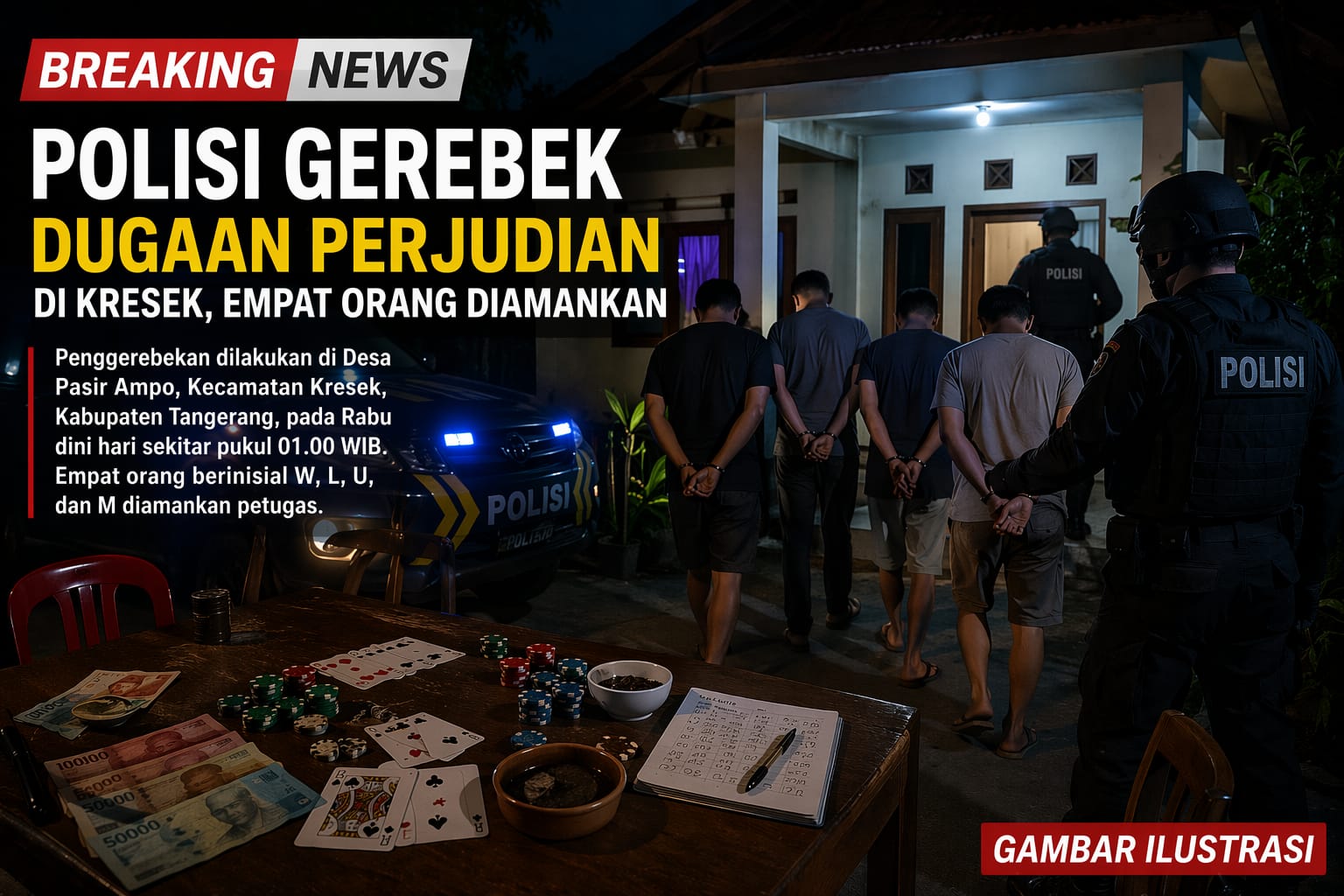 Kabupaten Tangerang, CeklisDua.net – Aparat kepolisian menggerebek dugaan praktik perjudian di Desa Pasir Ampo, Kecamatan Kresek, Kabupaten Tangerang, pada Rabu dini hari sekitar pukul 01.00 WIB.