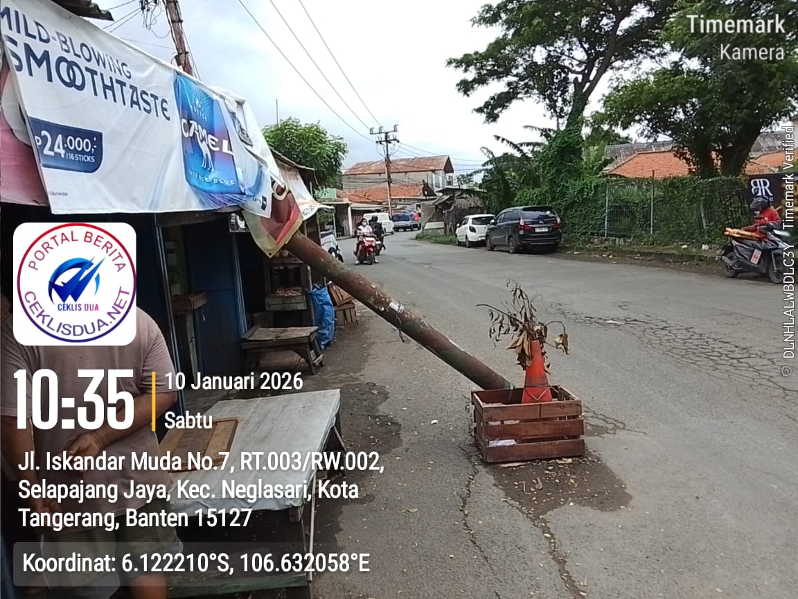 TangerangCeklisdua.net | Dugaan kelalaian pemeliharaan infrastruktur telekomunikasi kembali mencuat di Kota Tangerang. Sebuah tiang besi yang diduga milik layanan internet IndiHome dilaporkan roboh dan dibiarkan dalam waktu cukup lama di Jalan Iskandar Muda, Kelurahan Selapajang Jaya, Kecamatan Neglasari.