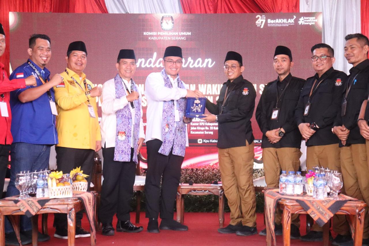 Mengenakan kemeja koko putih dan berpeci hitam, keduanya didampingi para pimpinan parpol pengusung dan parpol pendukung tampak tiba di kantor KPU Kabupaten Serang di kawasan Tamansari, Kota Serang, dengan iring-iringan drum band, hingga kesenian tradisional khas Banten terbang gede.