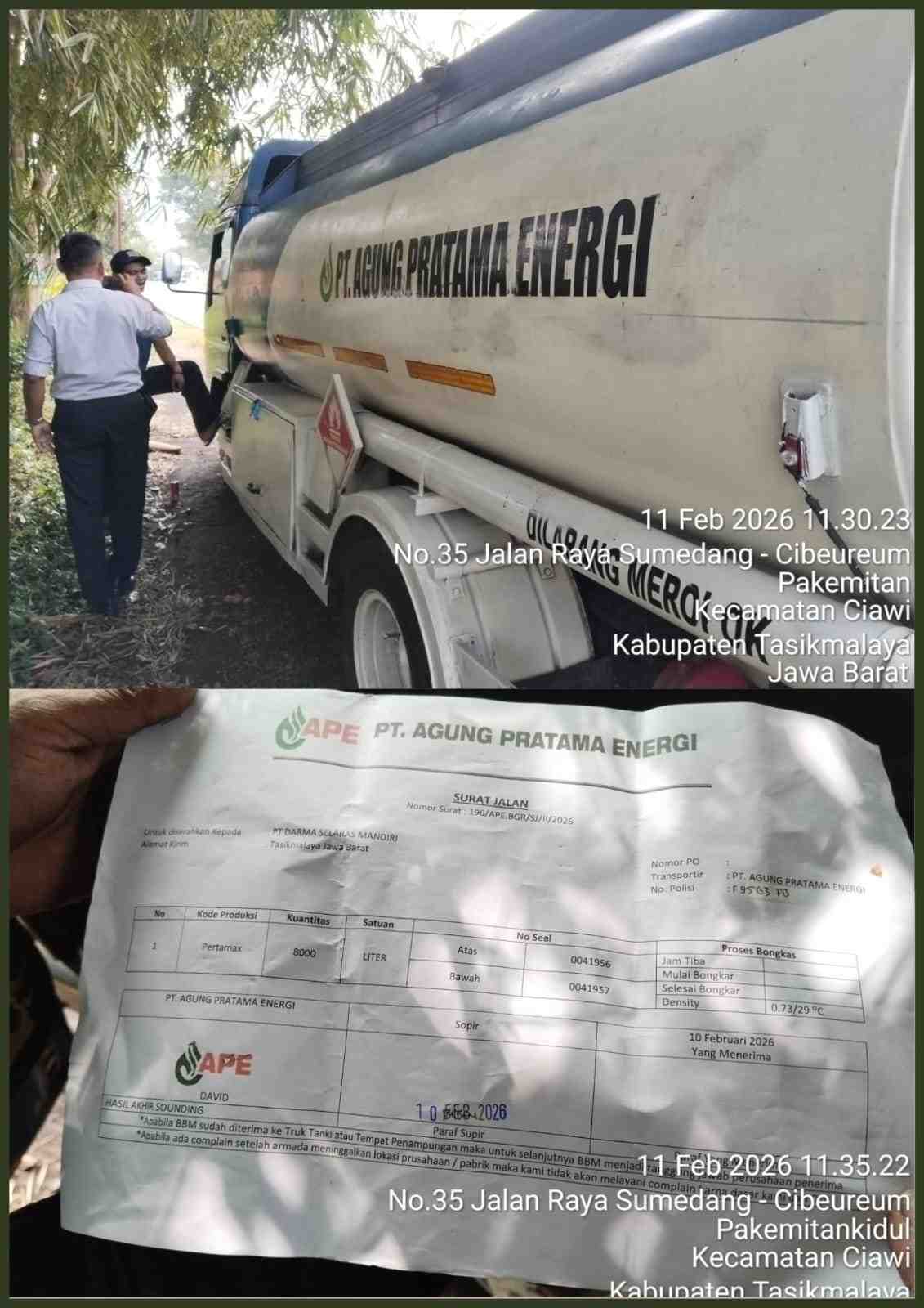 Dalam dokumen bernomor 196/APE.BGR/SJ/II/2026 tertanggal 10 Februari 2026, tercantum bahwa pengiriman dilakukan oleh PT Agung Pratama Energi sebagai pihak pengirim.