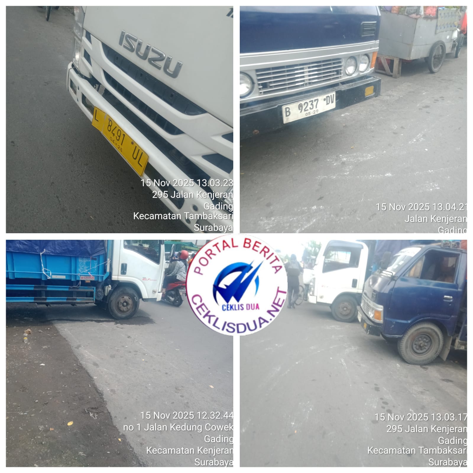 Surabaya, 15/11/2025. Ceklisdua net – Dua Truk ELF Nopol L 8491 UL dan B 9237 DV Parkir Tidak Pada Tempatnya di Sebelah Pospol Tambaksari Kedung Cowek