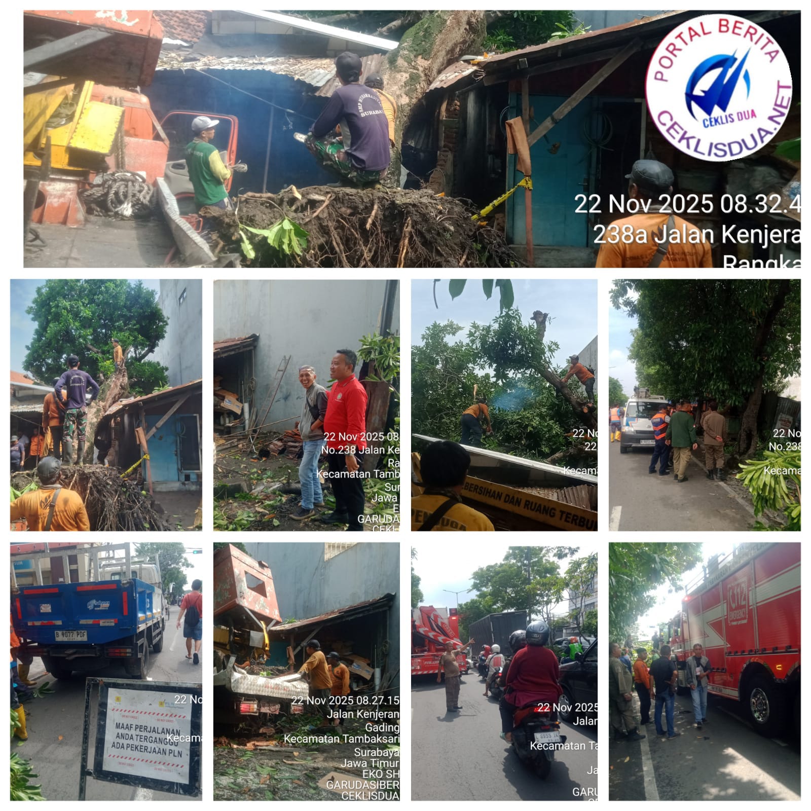 Hujan deras yang mengguyur wilayah Surabaya Jumat 21/11/2025 sekira jam 19.35 WIB. Dilokasi Jalan Raya Kenjeran Surabaya. Menyebabkan sebuah pohon besar tumbang dan menimpa satu rumah warga, dinas kebersihan, serta Ruang Terbuka Hijau (RTH). Insiden tersebut memicu kepanikan warga sekitar karena suara benturan yang sangat keras dan getaran kuat saat pohon jatuh menghantam bangunan Rumah.
