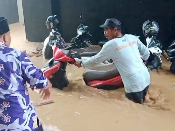 Beberapa sepeda motor sudah terjebak dalam genangan. Warga saling membantu mendorong kendaraan sambil mencari tempat yang lebih tinggi.