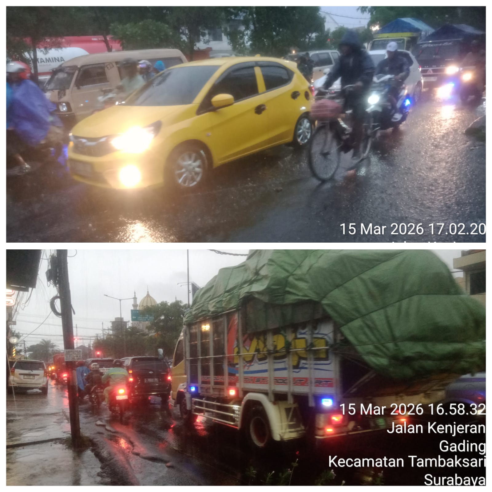 Arus kendaraan di sejumlah titik tetap berjalan, namun dengan kecepatan rendah atau merayap. Para pengendara terlihat lebih berhati-hati, terutama pengendara sepeda motor yang mengenakan jas hujan atau berteduh di pinggir jalan. Meski terjadi kepadatan, situasi lalu lintas secara umum masih terkendali.