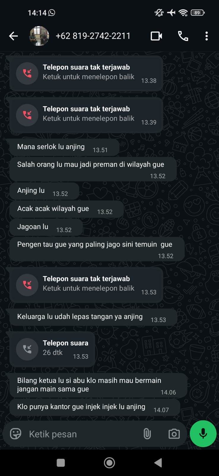 Isi pesan tersebut antara lain berbunyi, “Angkat anjing… mau tau gue siapa kan, sharelok kantor lu… salah orang lu… kalo punya kantor gue injek-injek… lu masih bau kencur aja mau main sama gue,” disertai makian dan tudingan pencurian yang tidak berdasar.