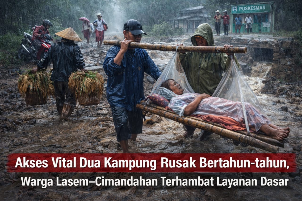 Pandeglang, Banten, Ceklisdua.net — Jalan utama Kampung Lasem beserta jembatan penghubung yang menjadi urat nadi mobilitas warga Kampung Lasem dan Kampung Cimandahan, Kecamatan Sobang, Kabupaten Pandeglang, hingga kini masih dalam kondisi rusak parah dan nyaris tak tersentuh perbaikan.