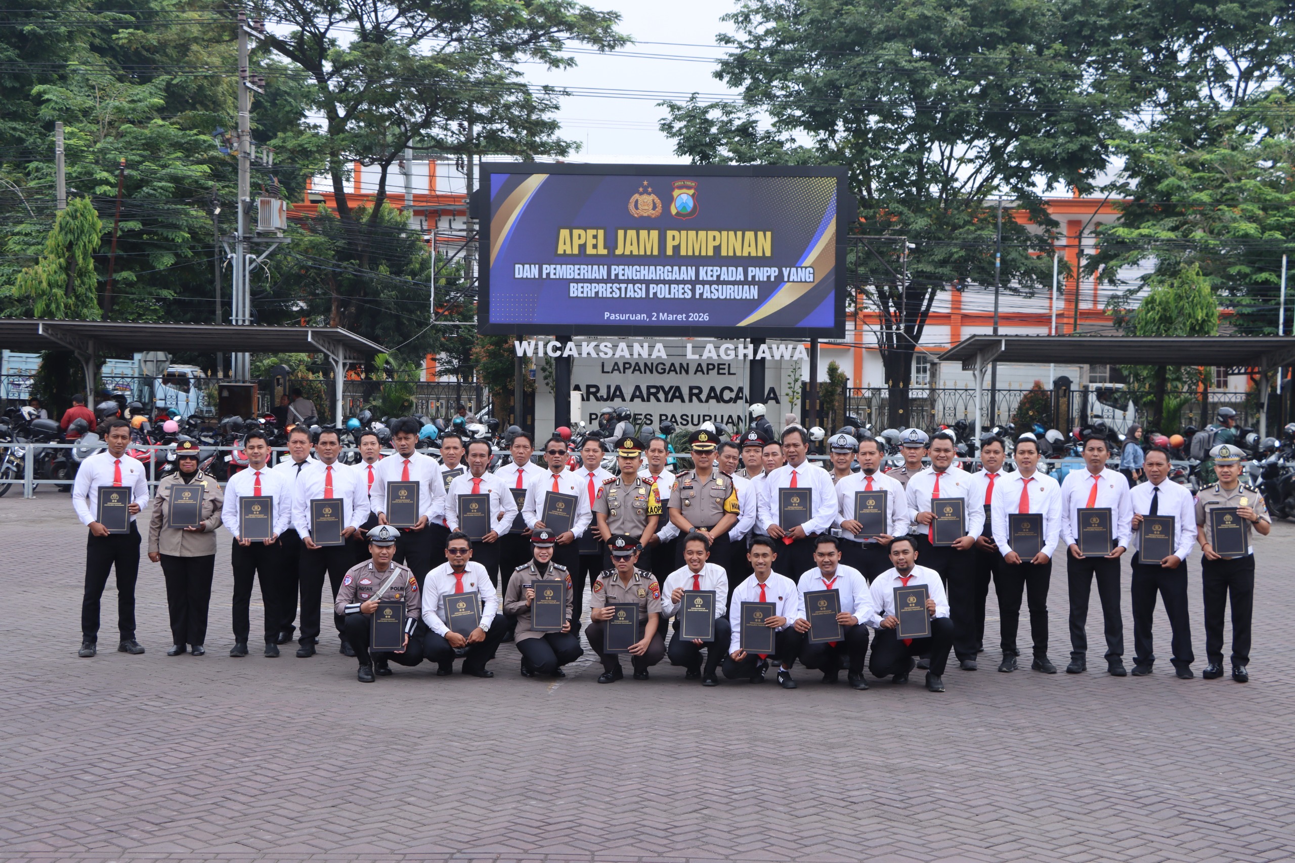 PASURUAN, CeklisDua.net – Polres Pasuruan menggelar Apel Pagi Jam Pimpinan yang dirangkaikan dengan pemberian penghargaan kepada Pegawai Negeri pada Polri (PNPP) berprestasi, Senin (2/3/2026) pukul 08.00 hingga 08.50 WIB. Kegiatan berlangsung di Lapangan Apel Sarja Arya Racana dan dipimpin langsung oleh Kapolres Pasuruan, AKBP Harto Agung Cahyono.