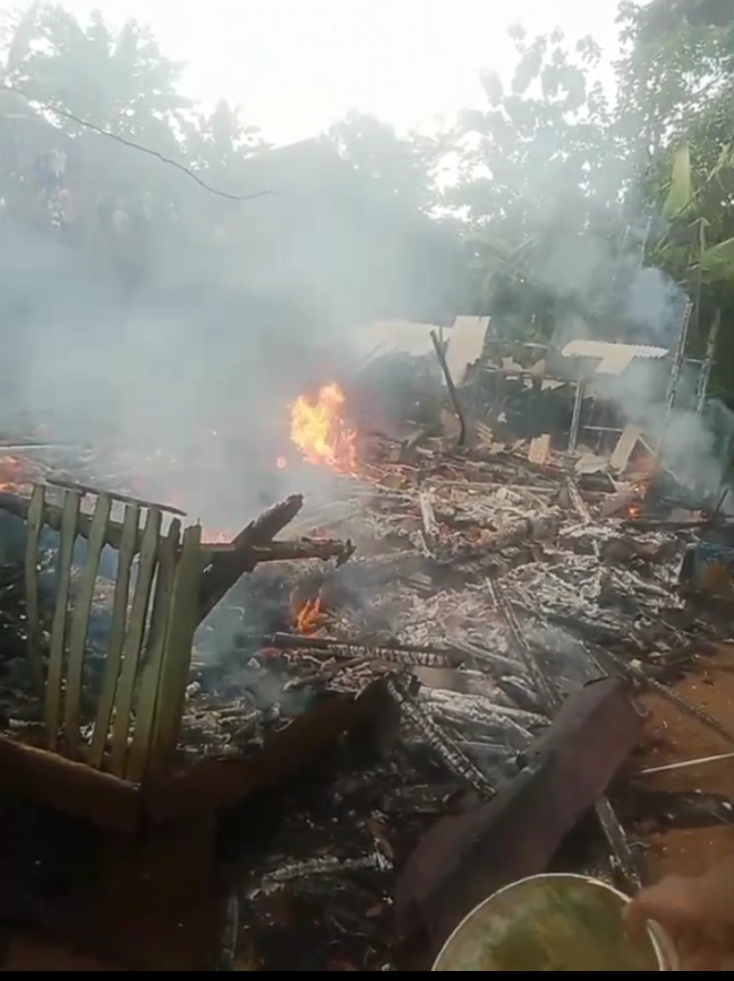 > “Warga langsung berdatangan membantu memadamkan api dengan alat seadanya. Api sudah terlanjur besar dan rumah habis terbakar,” ujar seorang warga setempat.