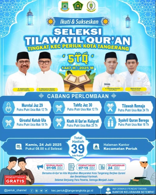 Seleksi Tilawatil Qur’an tingkat Kecamatan Periuk akan memperlombakan enam mata lomba dengan total hadiah mencapai Rp39 juta. Kompetisi ini diharapkan mampu memotivasi masyarakat, khususnya generasi muda, untuk semakin mencintai dan mendalami Al-Qur’an.