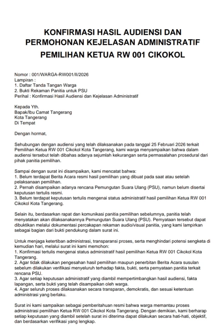 Surat bernomor 001/WARGA-RW001/II/2026 tersebut merupakan tindak lanjut dari audiensi pada 25 Februari 2026. Dalam surat itu, warga secara tegas menyatakan adanya dugaan cacat prosedur yang berpotensi menggugurkan legitimasi hasil pemilihan.