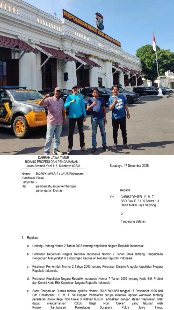 Kami tim media pada hari Rabu tanggal 17 Desember 2025 pukul 12:46 datang ke Polrestabes Surabaya untuk memenuhi panggilan terkait laporan kami ke Divisi Propam melalui QR terkait ditolak nya laporan kami di Polsek Tambaksari.