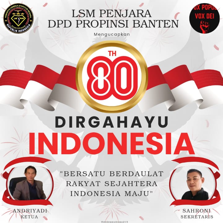 Banten, Ceklisdua.net || 17 Agustus 2025 — Lembaga Swadaya Masyarakat (LSM) Pemantau Kinerja Aparatur Negara (PENJARA) Dewan Pimpinan Daerah (DPD) Banten menyampaikan ucapan selamat memperingati Hari Ulang Tahun (HUT) ke-80 Republik Indonesia.