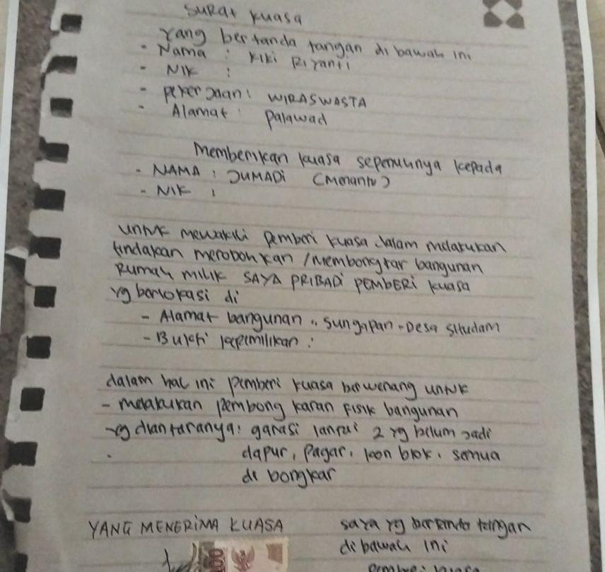 K menjelaskan bahwa tindakan pembongkaran fisik bangunan rumah tersebut bukan dilakukan tanpa alasan. Ia mengaku telah memberikan surat kuasa resmi kepada seseorang berinisial J untuk melakukan pembongkaran. Hal itu dilakukan setelah dirinya resmi bercerai melalui ikrar talak pada 7 Maret 2026.