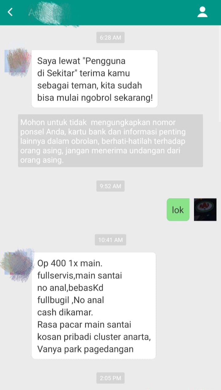Dari hasil tangkapan layar percakapan yang diterima redaksi, seorang pengguna dengan inisial “AM” menawarkan jasa “full service” dengan tarif tertentu dan menyebut tempat pertemuan di area hunian pribadi. Aktivitas serupa diduga dijalankan melalui aplikasi.