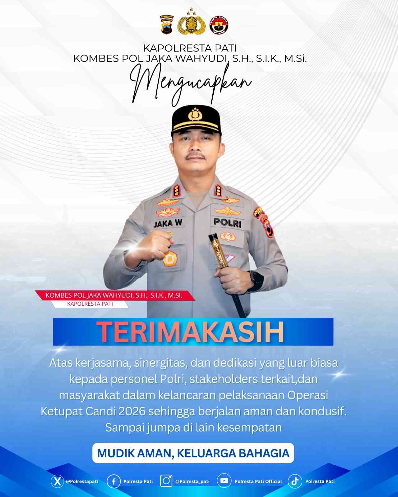“Kami mengucapkan terima kasih yang sebesar-besarnya kepada seluruh personel Polri, TNI, pemerintah daerah, serta stakeholder terkait yang telah bekerja tanpa lelah demi kelancaran Operasi Ketupat Candi 2026,” ujar Kombes Pol Jaka Wahyudi.