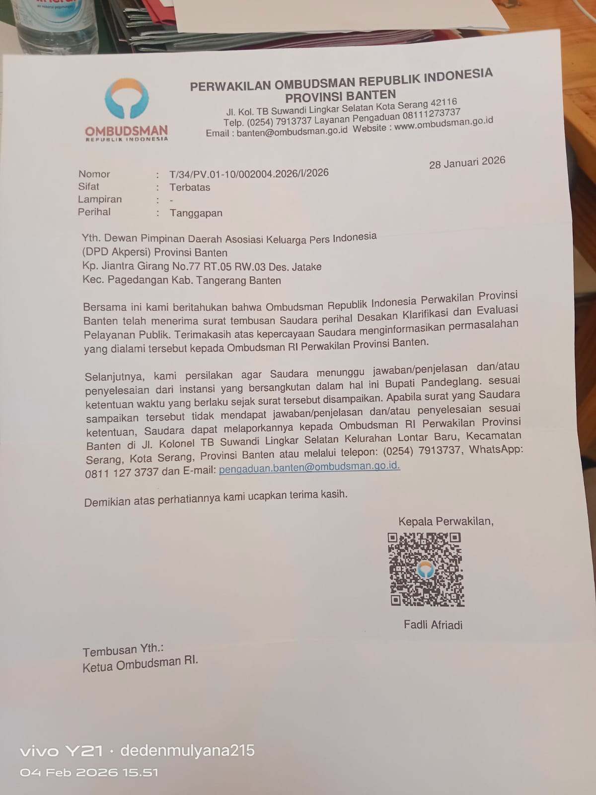 Hal tersebut tertuang dalam surat Ombudsman RI Perwakilan Banten bernomor T/34/PV.01-10/002004.2026/I/2026 tertanggal 28 Januari 2026, yang ditujukan kepada DPD AKPERSI Provinsi Banten.