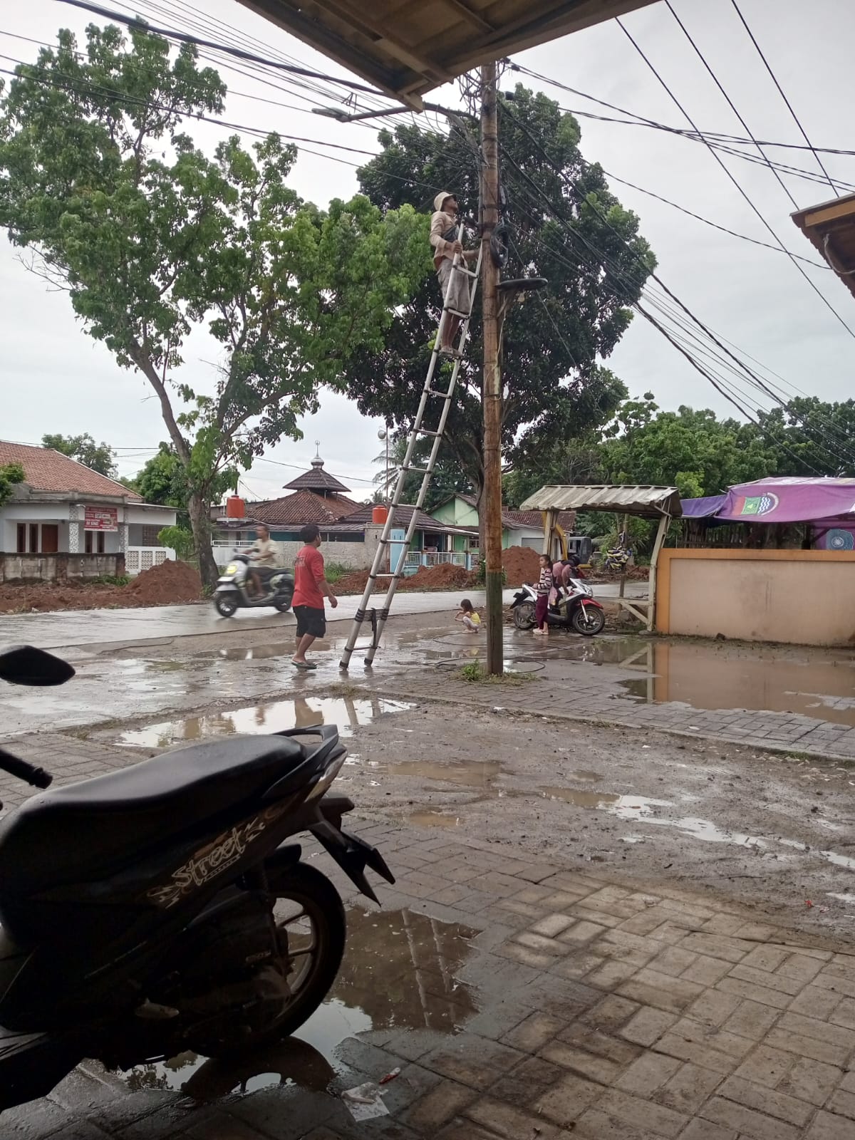 Pantauan di lapangan pada Rabu (12/11/2025) menunjukkan seorang pekerja menaiki tiang listrik menggunakan tangga alumunium saat hujan masih turun dengan intensitas ringan. Jalan di sekitar lokasi tampak berlumpur dan licin, namun pekerja tersebut terlihat tidak mengenakan helm keselamatan, sepatu safety, maupun sabuk pengaman.
