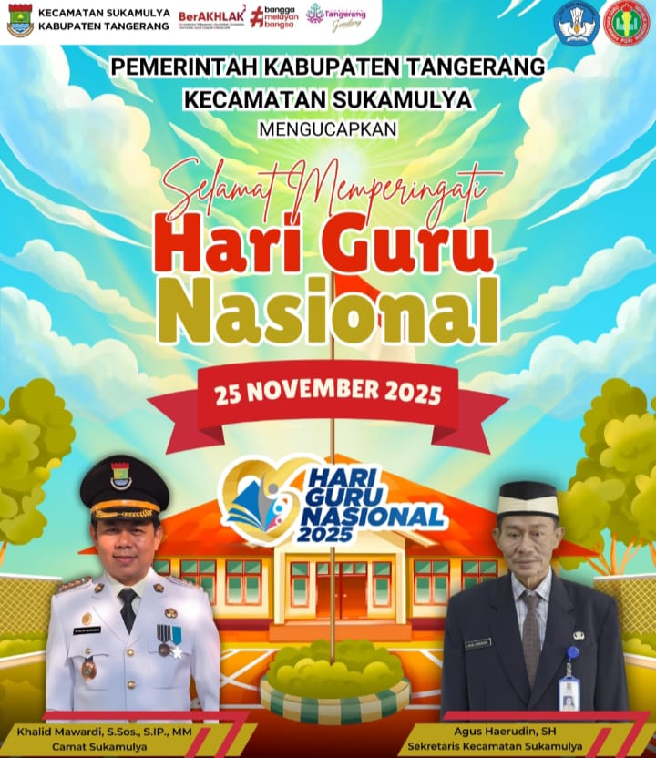 Tangerang, Ceklisdua.net – Pemerintah Kabupaten Tangerang melalui Kecamatan Sukamulya menyampaikan ucapan selamat memperingati Hari Guru Nasional (HGN) yang jatuh pada 25 November 2025. Peringatan ini menjadi momentum untuk mengapresiasi peran besar para pendidik dalam mencerdaskan kehidupan bangsa.