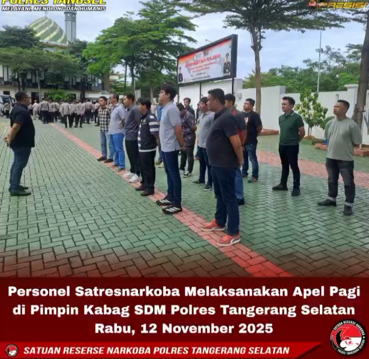 Tangerang Selatan, Ceklisdua.net – Dalam upaya meningkatkan kedisiplinan, profesionalitas, serta memperkuat solidaritas di internal kepolisian, Satuan Reserse Narkoba (Satresnarkoba) Polres Tangerang Selatan melaksanakan apel pagi di halaman Mapolres, Rabu (12/11/2025). Kegiatan rutin tersebut dipimpin langsung oleh Kepala Bagian Sumber Daya Manusia (Kabag SDM) Polres Tangerang Selatan. (12/11/25)