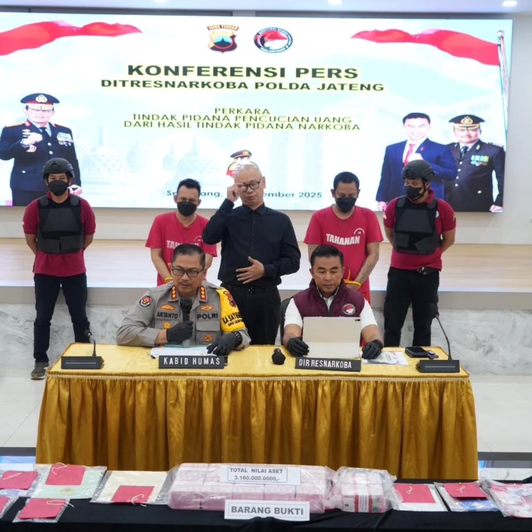 Konferensi pers dipimpin Kabid Humas Polda Jateng, Kombes Pol Artanto, didampingi Dirresnarkoba Polda Jateng, Kombes Pol Anwar Nasir. Kasus TPPU ini merupakan pengembangan dari penyidikan narkotika yang dimulai Oktober 2025.