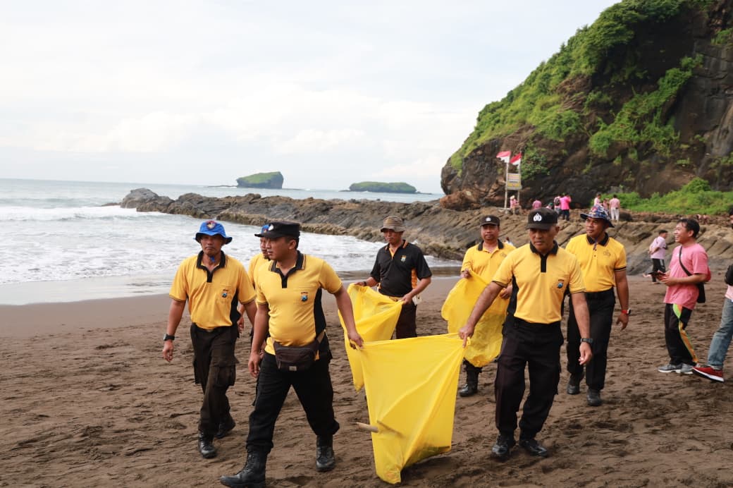Sejumlah Pejabat Utama Polres Jember, Muspika Kabupaten Jember yang terdiri dari unsur TNI, pemerintah kecamatan, desa, serta elemen masyarakat menyisir dan membersihkan sampah di pesisir pantai.