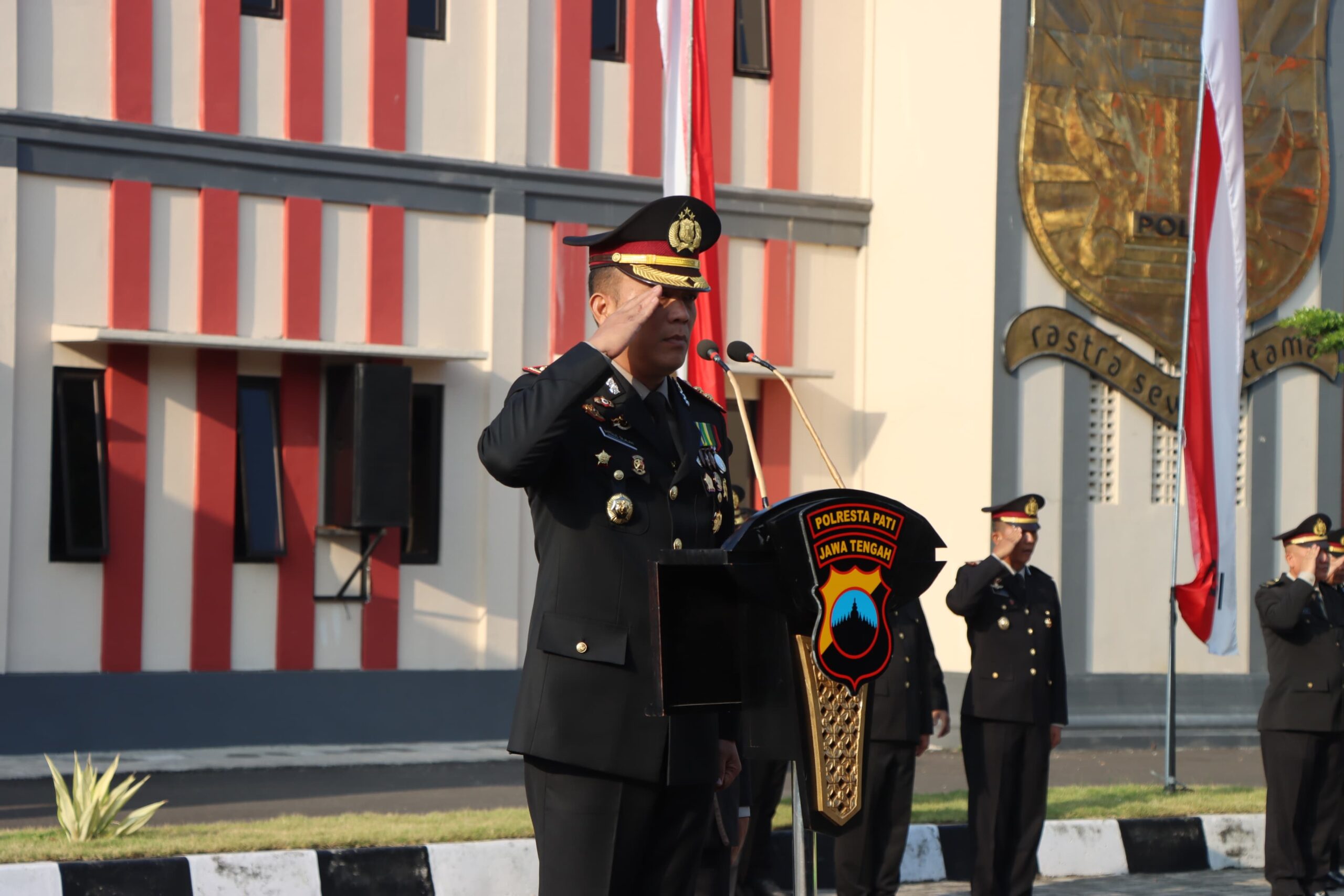 Peserta upacara terdiri dari pejabat utama Polresta Pati, perwira staf, Polwan, Bhabinkamtibmas, Satlantas, Sat Samapta, Satpolairud, Intelkam, Resnarkoba, Reskrim, Tahti, ASN Polresta, hingga Bintara Remaja. Seluruh pasukan membentuk barisan lengkap sesuai komposisi peleton masing-masing.