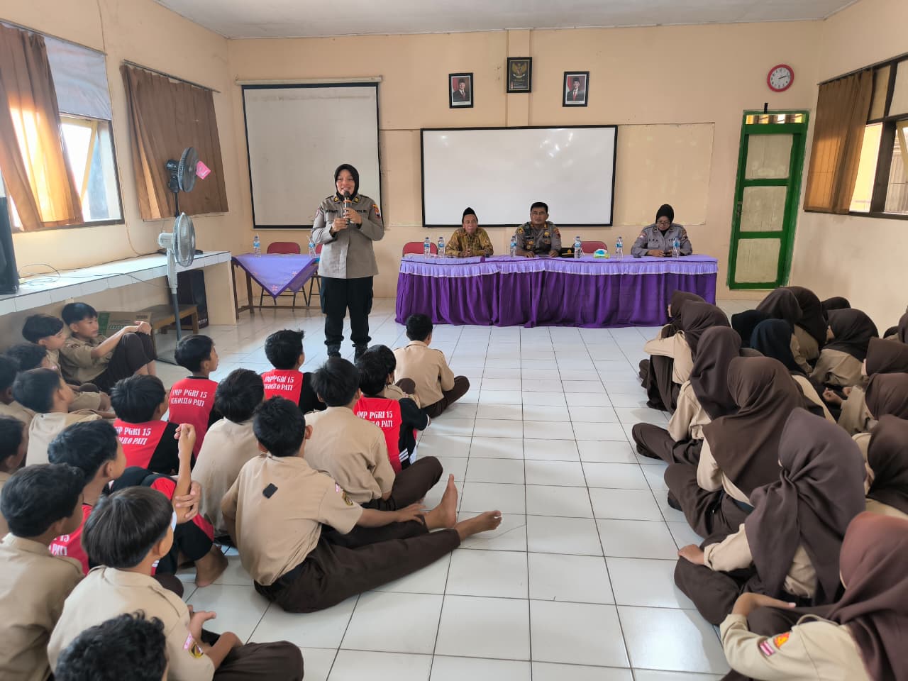 PATI, Ceklisdua.net – Dalam upaya mencegah kenakalan remaja dan memperkuat kesadaran hukum di kalangan pelajar, Kepolisian Sektor (Polsek) Sukolilo bersama Satuan Binmas Polresta Pati menggelar kegiatan Himbauan Kamtibmas, Edukasi dan Pembinaan kepada siswa-siswi SMP PGRI 15 Sukolilo. Kegiatan berlangsung di Aula sekolah setempat, Desa Prawoto, Kecamatan Sukolilo, Kabupaten Pati, pada Jumat (17/10/2025) pukul 08.00 WIB hingga selesai.