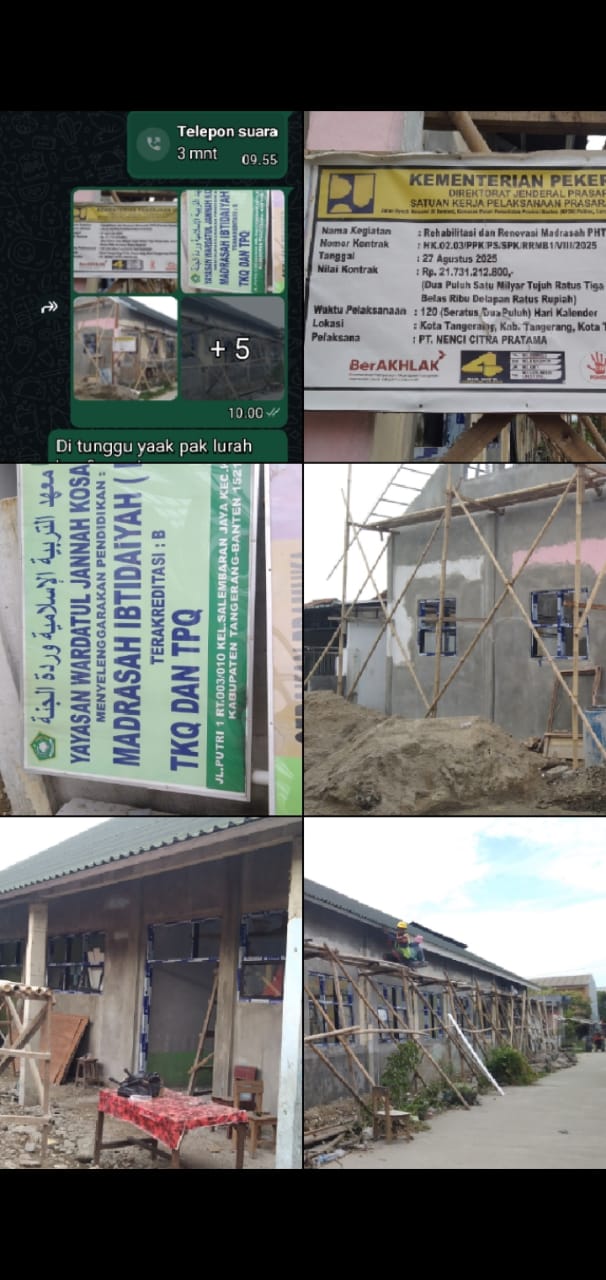 Tangerang, Ceklisdua.net — Proyek rehabilitasi dan renovasi bangunan madrasah di wilayah Kelurahan Salembaran Jaya, Kecamatan Kosambi, Kabupaten Tangerang, kini menjadi sorotan publik. Berdasarkan informasi yang tertera pada papan proyek di lokasi, kegiatan tersebut merupakan program Kementerian Pekerjaan Umum dan Perumahan Rakyat (PUPR) melalui Direktorat Jenderal Prasarana Strategis, di bawah Satuan Kerja Pelaksanaan Prasarana Strategis Banten. (05/11/25)