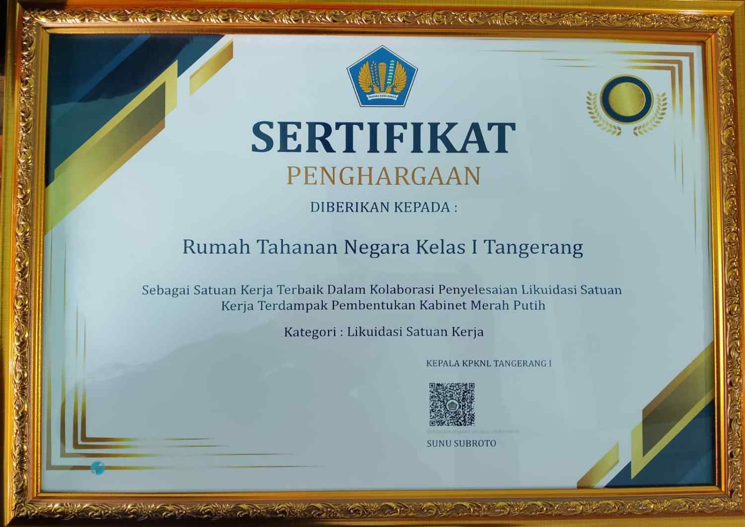 Penghargaan ini diberikan kepada Rutan Kelas I Tangerang sebagai Satuan Kerja Terbaik dalam Kolaborasi Penyelesaian Likuidasi BMN pada satuan kerja terdampak pembentukan Kabinet Merah Putih, sebagai bentuk apresiasi atas kinerja, kepatuhan, serta sinergi yang baik dalam pengelolaan aset negara.