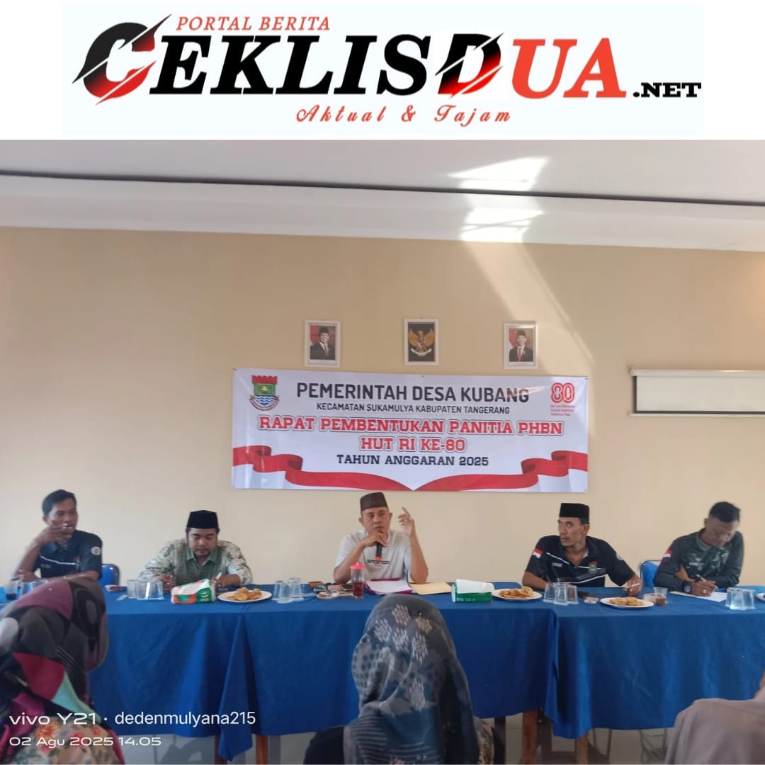 Kabupaten Tangerang, Ceklisdua.net -Semangat kemerdekaan mulai terasa di Desa Kubang, Kecamatan Sukamulya, Kabupaten Tangerang. Aula kantor desa siang itu terasa hangat, bukan hanya karena sinar matahari yang menembus jendela, tapi juga karena semangat kebersamaan yang begitu terasa dalam rapat pembentukan panitia peringatan HUT ke-80 Republik Indonesia. (2/08/2025).