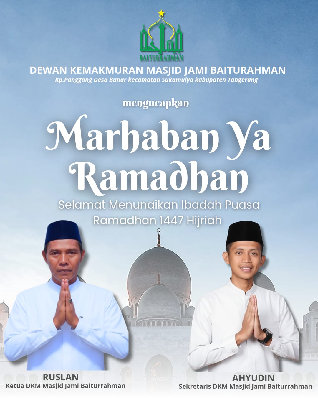 Tangerang, CeklisDua.net – Menyambut bulan suci yang dinanti-nantikan oleh seluruh umat Islam, Dewan Kemakmuran Masjid (DKM) Jami Baiturrahman yang berlokasi di Kp. Panggang, Desa Bunar, Kecamatan Sukamulya, Kabupaten Tangerang, mengucapkan selamat menunaikan ibadah puasa kepada seluruh kaum muslimin. Rabu (18/02/2026)
