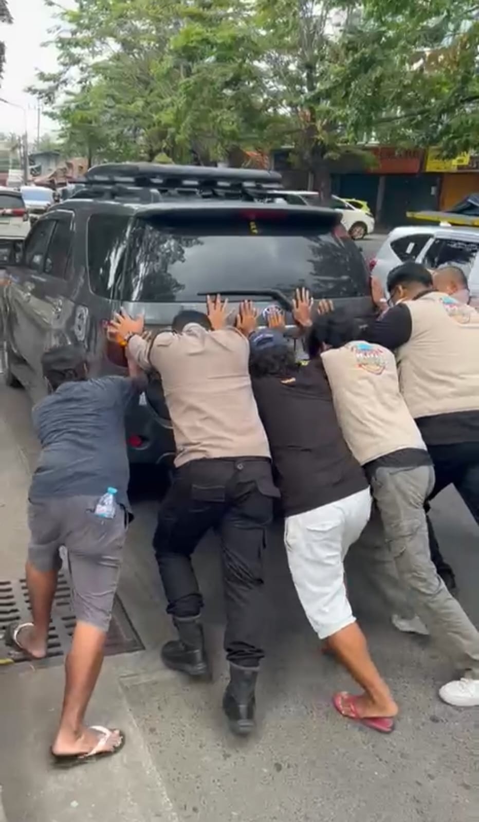 Mengetahui kejadian tersebut, anggota Pos PAM yang sedang melaksanakan tugas pengamanan dan pelayanan langsung bergerak cepat. Tanpa menunggu lama, petugas segera memberikan bantuan dengan mendorong kendaraan ke posisi yang lebih aman di tepi jalan.