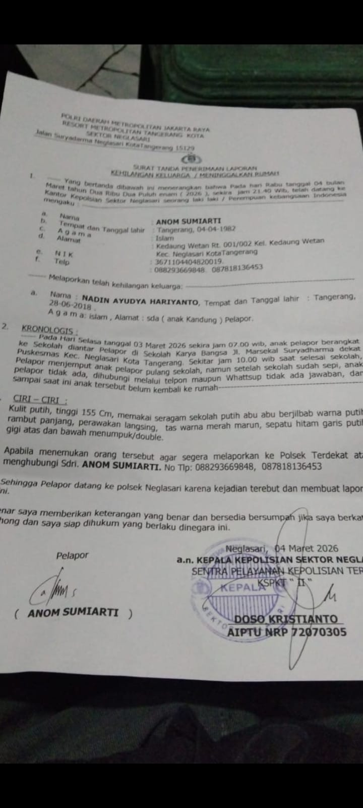 Seorang remaja perempuan bernama Nadin Ayudya Haryanto (17) dilaporkan hilang sejak Selasa, 3 Maret 2026. Hingga kini, Nadin belum kembali ke rumah dan keberadaannya masih belum diketahui, membuat keluarga terus diliputi kecemasan.