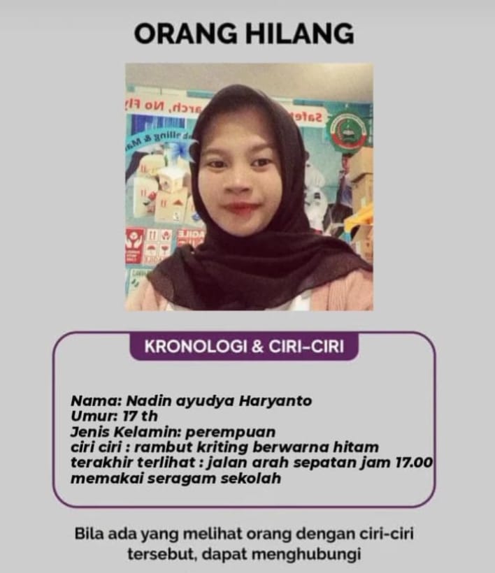 Bagi masyarakat yang melihat atau memiliki informasi mengenai keberadaan Nadin Ayudya Hariyanto, diharapkan segera menghubungi: