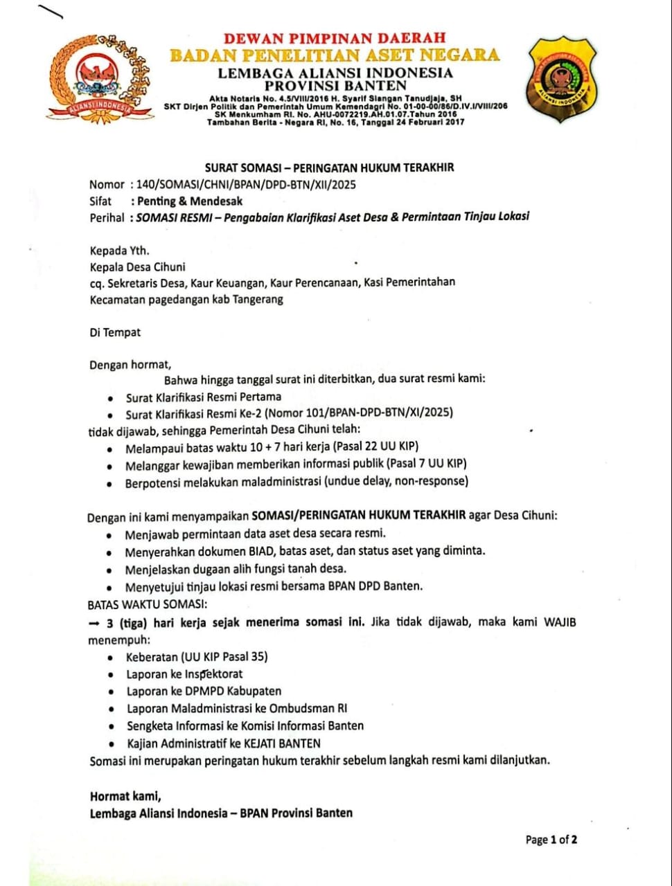 Surat Klarifikasi Pertama, Klarifikasi Kedua, hingga Somasi Peringatan Hukum Terakhir tersebut berkaitan dengan kewajiban keterbukaan informasi publik, khususnya menyangkut pengelolaan dan kejelasan aset desa. Adapun surat-surat tersebut telah ditujukan kepada Pemerintah Desa Cihuni, Desa Situ Gading, Desa Pagedangan, Desa Cijantra, dan Desa Kadu Sirung, serta ditembuskan kepada Ketua APDESI Kecamatan Pagedangan.