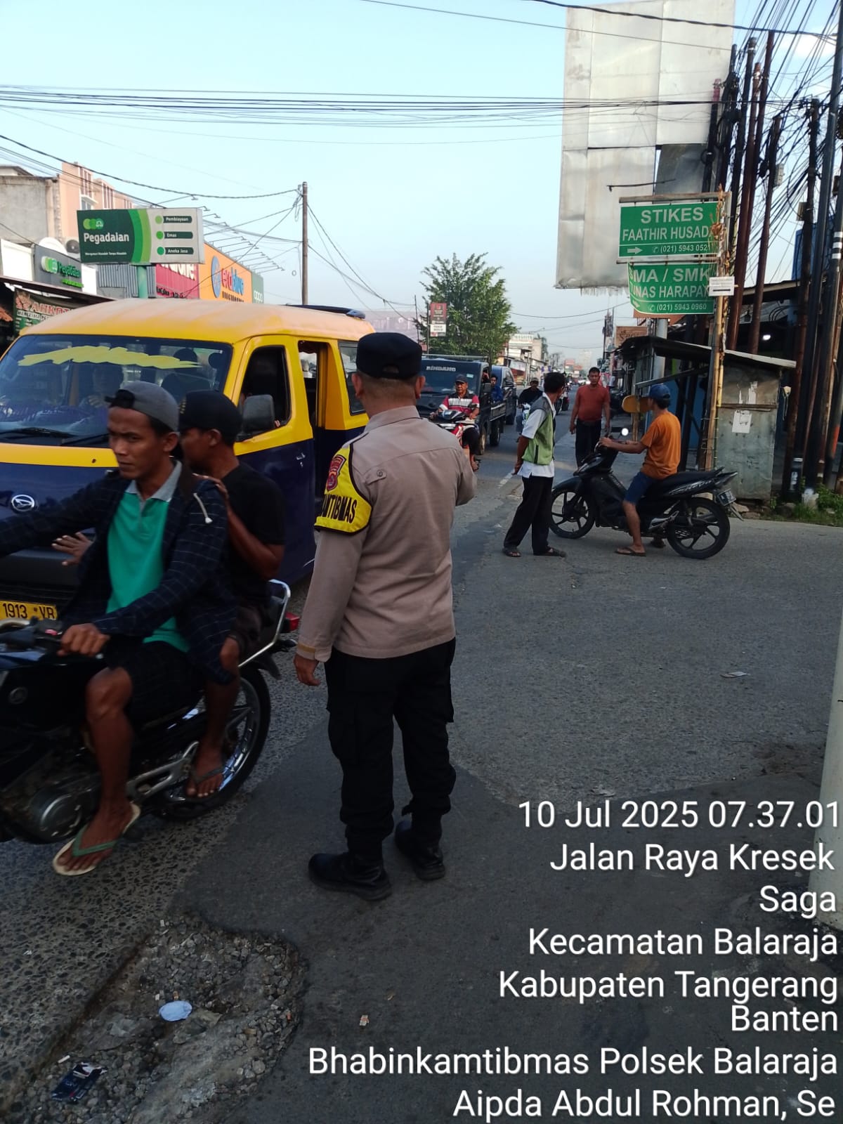 Ceklisdua.net, Kabupaten Tangerang – Anggota Bhabinkamtibmas Polsek Balaraja Aipda Abdul Rohman SE melakukan pengaturan lalu lintas Pagi Hari Demi terwujudnya Pelayanan Prima di Wilayah Jalan Raya Kresek Perempatan Saga Kecamatan Balaraja Wilayah Hukum Polsek Balaraja Polresta Tangerang. Kamis (10/07/2025).