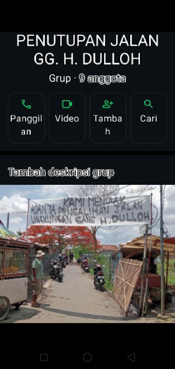 Dalam foto profil grup tersebut terlihat spanduk besar terbentang di mulut gang bertuliskan “Kami Menolak Penutupan dan Pengalihan Jalan Lingkungan Gang H. Dulloh”. Spanduk itu dipasang oleh warga sebagai bentuk penegasan sikap menolak segala bentuk tindakan yang dianggap merugikan masyarakat.